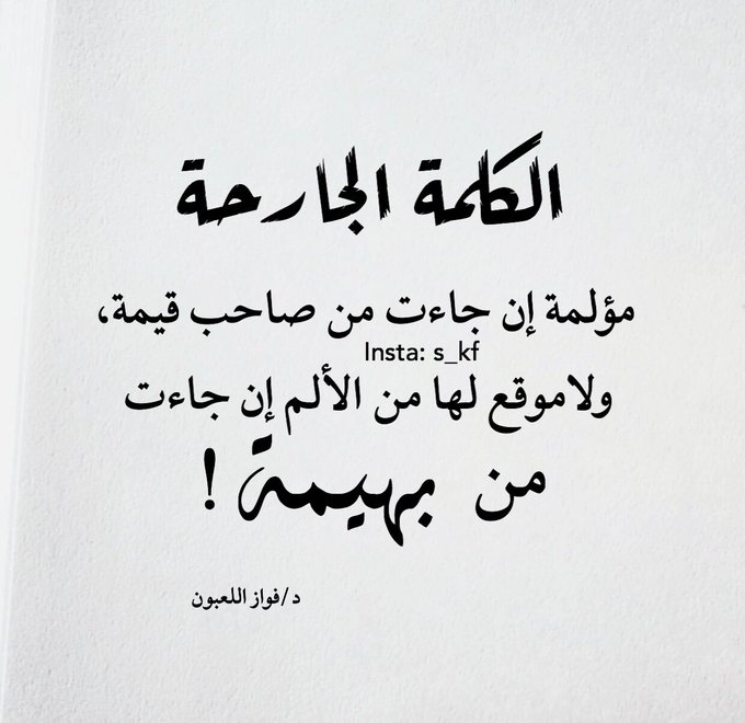 - بعض الأشخاص لا يدركون تأثير الكلمات الجارحة على نفسية الإنسان. فهذه الكلمات يمكن أن تؤثر بشكل ملحوظ وسلبي على حياته، مما يجعله يشعر بالاكتئاب والضيق. قد تبدو الكلمة بسيطة وصغيرة في نظر البعض، لكنها قد تكون ثقيلة كالحبل الذي يربط قلب وعقل الإنسان، أو كحد السكين الذي يمكن أن يجرحه، ولها القدرة على الوصول إلى أعماق نفسيته.