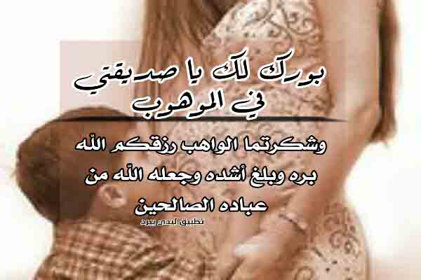 - بهذه المناسبة السعيدة نتقدم إليكم يا صديقتي “الاسم” أنته وعائلتك وزوجتك بأحر التهاني وأجمل الأماني بالمولود الجديد داعين له بحياة سعيدة تحت ظل أبويه الأكرمين الف الف مبروك يا صديقتي وعسى الله يبلغكم الذرية الصالحه ان شاء الله.