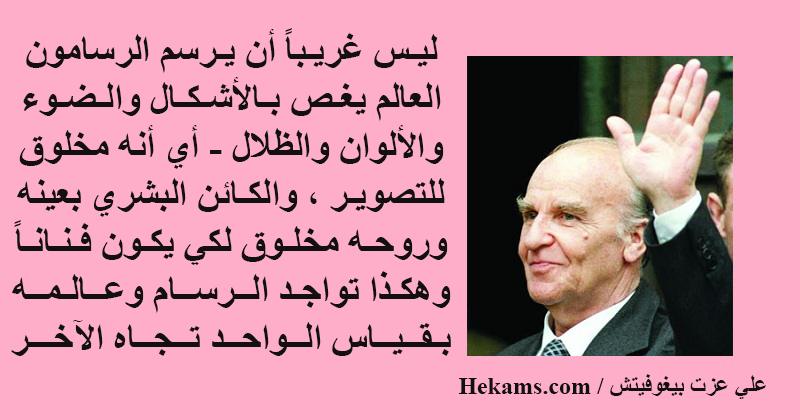 - ليس غريباً أن يرسم الرسامون ، العالم يغص بالأشكال والضوء والألوان والظلال – أي أنه مخلوق للتصوير ، والكائن البشري بعينه وروحه مخلوق لكي يكون فناناً ، وهكذا تواجد الرسام وعالمه بقياس الواحد تجاه الآخر. – علي عزت بيغوفيتش.