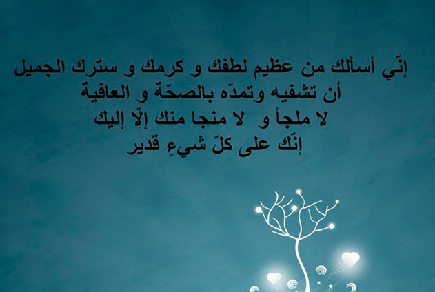- ((اللهم يا من تعيد المريض لصحته وتستجيب دعاء البائس، اللهمّ إنّا نسألك بكل اسمٍ لك أن تشفي حبيبي، اللهم إنا نسألك باسمك الشافي أن تعفو عنه وتشفيه، اللهم لا ملجأ ولا منجا منك إلا إليك إنك على كل شيء قدير)).