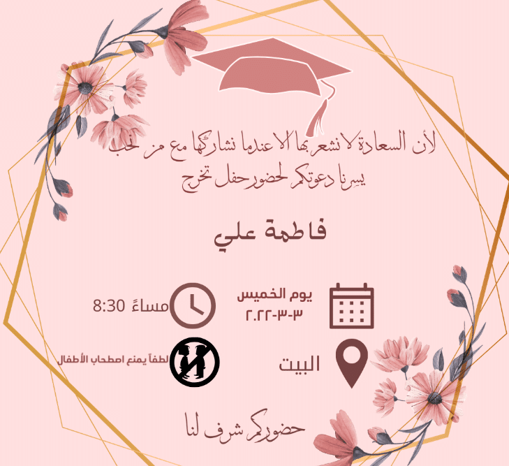 - السلام عليكم ورحمة الله دعوة لجميع الاهل والاصحاب والاحباب شاركوني فرحتي بحضور حفل تخرجي يوم “اليوم” الساعة “الزمن”.