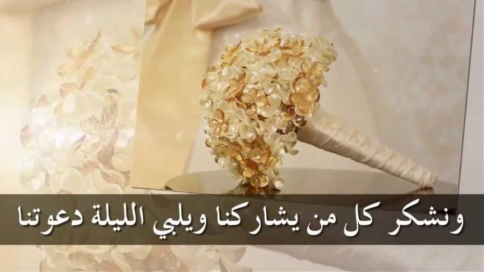 - عندما يكمل القمر ليلته الرابعة عشر من هذا الشهر ( ) يسرنا تشريفكم لنا في قاعة( ) لنوقد الشموع وننثر الزهور وتدق الدفوف احتفالا بزفاف ابنتنا/ ….. يدعوكم أحلى عريس …….. و أحلى عروس …….. لحفل زفافهم الميمون يوم ……… الموافق ……… في صالة وبحضوركم تكتمل الأفراح .