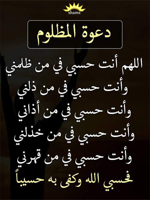 - دعاء المظلوم يا رب الظالم ملك أسباب القوة في الدنيا وأنا عبيدك لا أملك إلا إيماني بك وتوكلي عليك ودعائي يا رب ان الظالم جمع جنده وسلاحه وسجونه وزنازينه ومنع عنى الأهل والأحباب وتركني في ظلمة الزنزانة على الأرض والتراب وأنا عبيدك جمعت له ما استطعت من الدعاء يا رب تمنيت لمن ظلمني الهداية والتوبة وتمنى هلاكي وتدميري ولا حول ولا قوة إلا بك فمن يا رب على دعوة عبيدك المسكين الفقير بوعزتى وجلالك لأنصرنك ولو بعد حين.