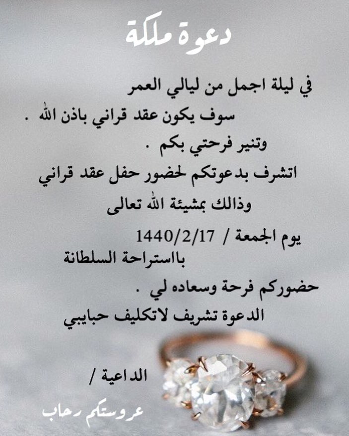 - الفرح و السعادة بشوفتكم أعرفها يوم ألقاكم و بالدعوة الي وصلتكم من جوا القلب دعيناكم بالمراحب و الهلا اهنيكم و يجعل الأفراح دنياكم في صالة …يوم … الموافق …