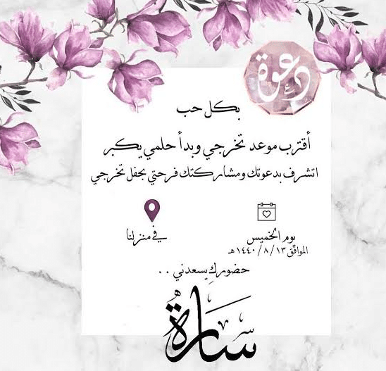 - السلام عليكم يشرفني دعوتكم لمشاركتنا أفراح تخرجي، وذلك بمناسبة حصولي على درجة “الدرجة” من جامعة “اسم الجامعة” موعد المناسبة يوم “اليوم”، الموافق “التاريخ” في قاعة “اسم القاعة”.