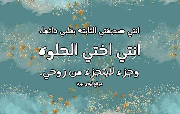 - الى اختي حبيبتي احبك بحجم نقاؤك وصفاؤك بحجم تلك المشكلات التي تذهبيها عني احبك بحجم تلك الابتسامة التي ترسميها على وجنتي حين حزني و بحجم تلك الكلمات التي تواسيني بها عند ألمي تتوق احرفي لخط كلمات تعبر بها عنك وتخجل تلك الاحرف من وصفك استدعي الحروف لأصف بها حنانك وانك اختي وحبيبتي وصديقتي وأمان قلبي وملجأ حزني احبك جدا قطعه من قلبي و رفيقة روحي أنتي أختي وصديقتي التي لا تعوض ولاتستبدل.
