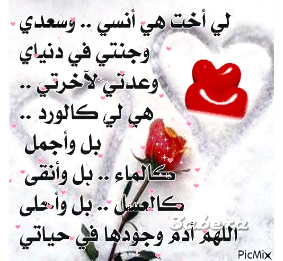 - لي أخت لو استبدلوها بخيرات الأرض قاطبة لا أبدلها، لي أخت هي أنسي وسعدي، وجنتي في دنياي وعدتي لآخرتي، هي لي كالورد، بل وأجمل كالماء بل وأنقى، كالعسل بل وأحلى، اللهم أدم وجودها في حياتي.