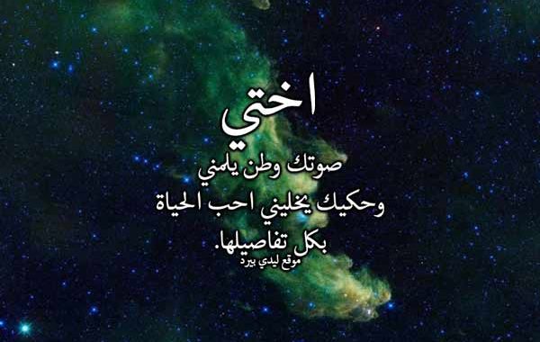 - أختي أنت سندي وأنسي وفرحي بقربك هنائي وفي بعدك شقائي، مرشدتي في الصغر ومعينتي في الكبر، لا يمكن لأي شخص أن يحل مكانك ولا يمكن أن يسكن قلبي أغلى منك.