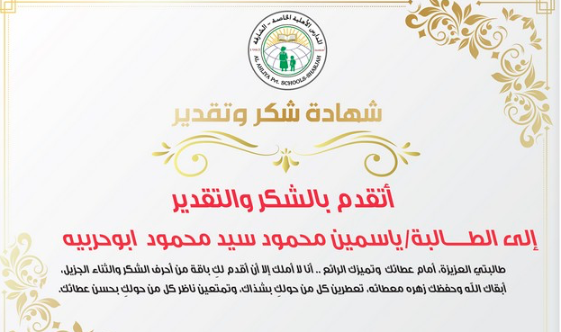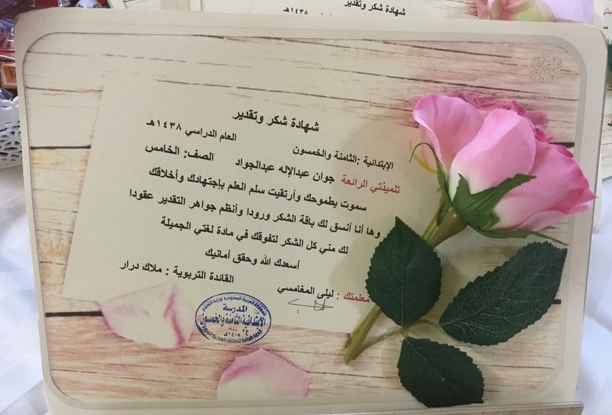 - شكرا طالبتي يهيم ثنائي بين موج إبداعك وعظيم هنائي بدوام عطائك… يا زهرة ربيعية تناثر منها العبق ليرنو مصافحا الشفق… أسدلي الأشرعة وأبحري معطرة المدى واجعلي بُنيتي لك في كل نحو للعلم صدى، يا من أبهجتني دوما بتفوقك.. عين الرحمن تحرسك.. وأنار بنوره أدربك.. ودمتي شعلة وضاءة، تحية تقدير واحترام .. و أمنية القلب لك بالتوفيق مسك الختام، معلمتكِ الفخورة بتحصيلكِ وجهودكِ.