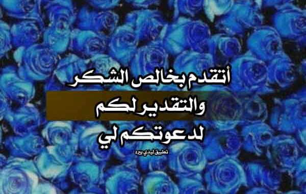 - أتقدم بجزيل عبارات الشكر وعظيم الإمتنان على تلبية دعوه “اسم مقدم الدعوه” واقول له كتب الله لك عظيم الأجر والثواب وشكراً للجميع.