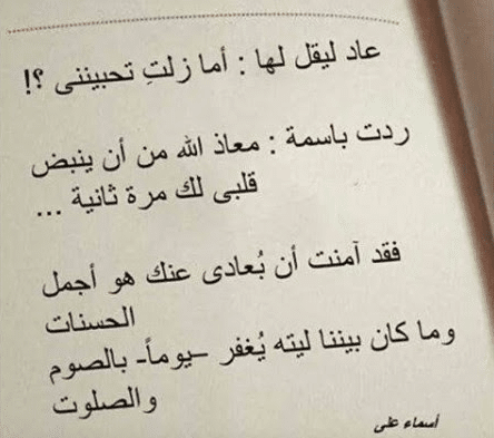 - أسفي على الشخص الذي أحببته من داخل قلبي، وتمنيت يوماً واحداً فقط بجانبه. وبعد أن هدانا الله سبحانه وتعالى لطريق الصواب ومنّ علي بأن أكون زوجةً له يغضبني كثيراً، ولا يهتم كالسابق لمغازلتي ومصالحتي. وكأنني أعيش كابوساً لم أستيقظ منه بعد.