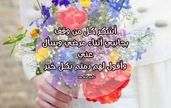 - الحمدلله والشكرا لله الذي عافاني من مرضي واتم الشفاء واداني الصحه والعافيه حاب اشكر “الاسم” الذي وقف معاي في مرضي وجاني فالمستشفى والبيت لك كل الشكر والعرفان.